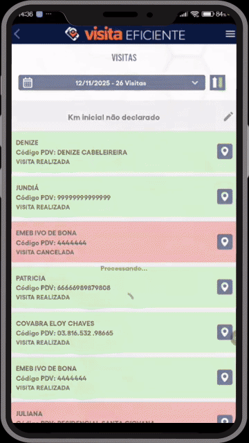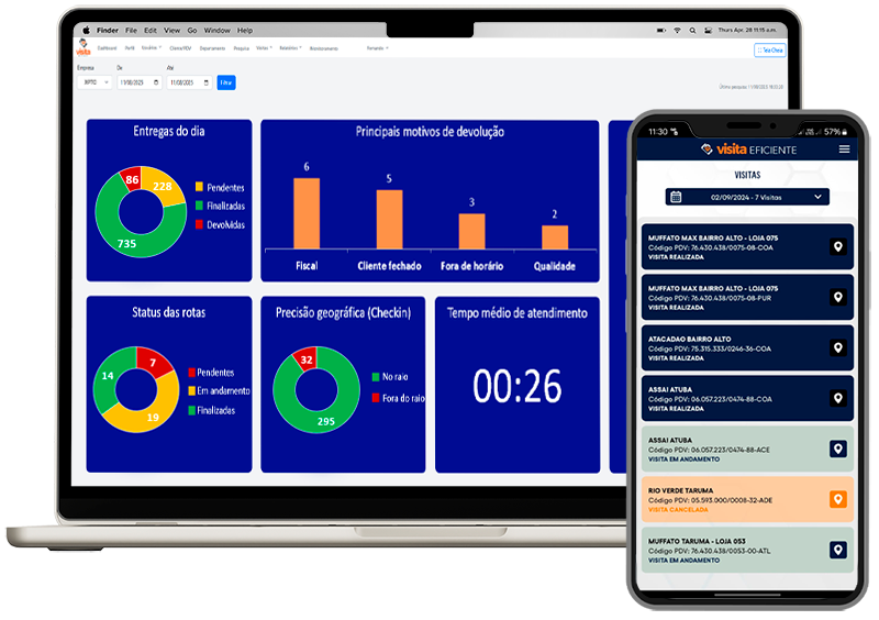 Acompanhe em tempo real o “rastro” da equipe no mapa e tenha relatórios automáticos de produtividade, visitas realizadas vs. canceladas e tempo de